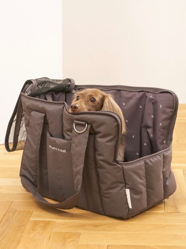水や摩擦に強いコーデュラ生地を使用したキルティングキャリーバッグ。発売以来人気のアイテムが、さらに便利になってリニューアルです。新たに底鋲を付け、平置きしたときの安定感と汚れにくさがUP。さらに、中に入ったクッションのカバーを外して洗えるようになりました。6kg程度までの犬や猫を想定したサイズで、上部のフタはファスナーでぐるりと全開する仕様。側面のポケットにはお財布やペットボトル等が入ります。持ち手が短めで持ちやすく、肩掛け用のブランドロゴ入りストラップも付属する2WAY仕様。アイス柄の裏地には綿を入れてふかふかに仕上げています。色は定番のブルー、ピンク、ベージュと、新たに落ち着いた印象のチャコールグレーをご用意しています。お揃いのハーネスやリードと合わせてお楽しみください。