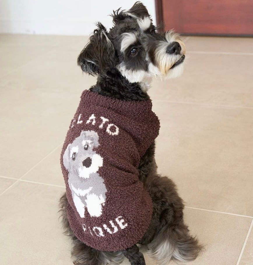 ミニチュアシュナウザーに着せるとキュートな、シュナウザー柄の’ベビモコ’プルオーバーです。背中側に、シュナウザーの愛らしい姿をジャガードで表現。シュナウザーの毛色に似合う落ち着いたブルーと、シックなブラウンの2色をご用意しました。シュナウザーのオーナー様へのギフトにもおすすめのアイテムです。