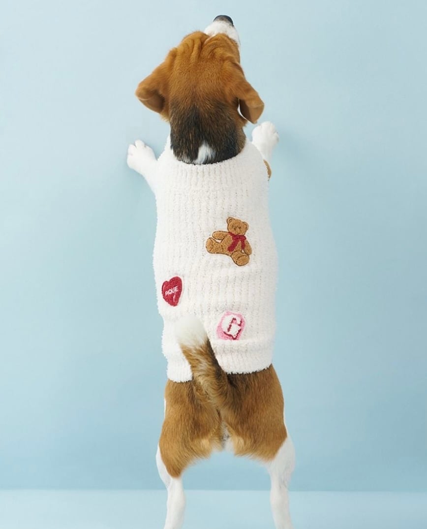 お気に入りのベアのぬいぐるみと暮らす、女の子のキュートなお部屋をイメージしたシリーズです。もっちり柔らかい‘ベビモコ’を畦編みにして使用したプルオーバー。背中にはベアのぬいぐるみとハートのクッション、雑誌から切り抜いたような『G』のサガラワッペンを施しました。色はアイボリー、ピンク、ネイビーの3色展開。オーナー様のルームウェアとお揃いで着用いただけるアイテムです。