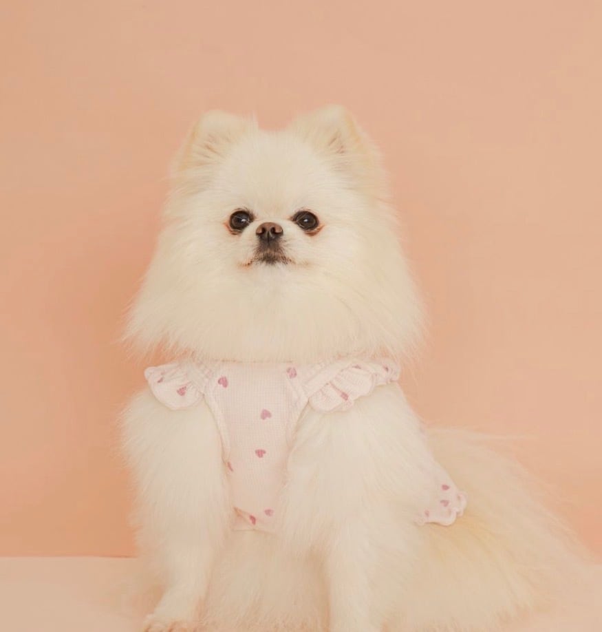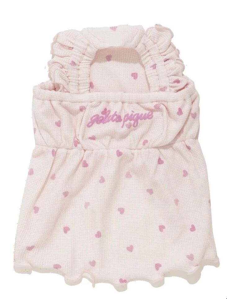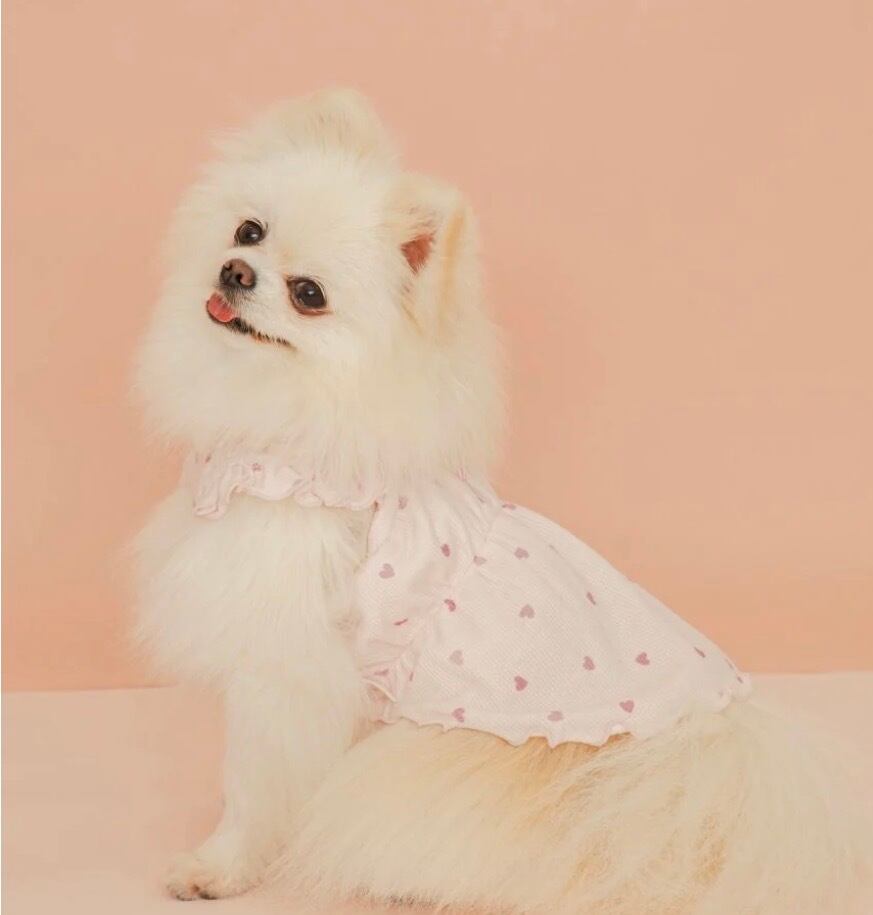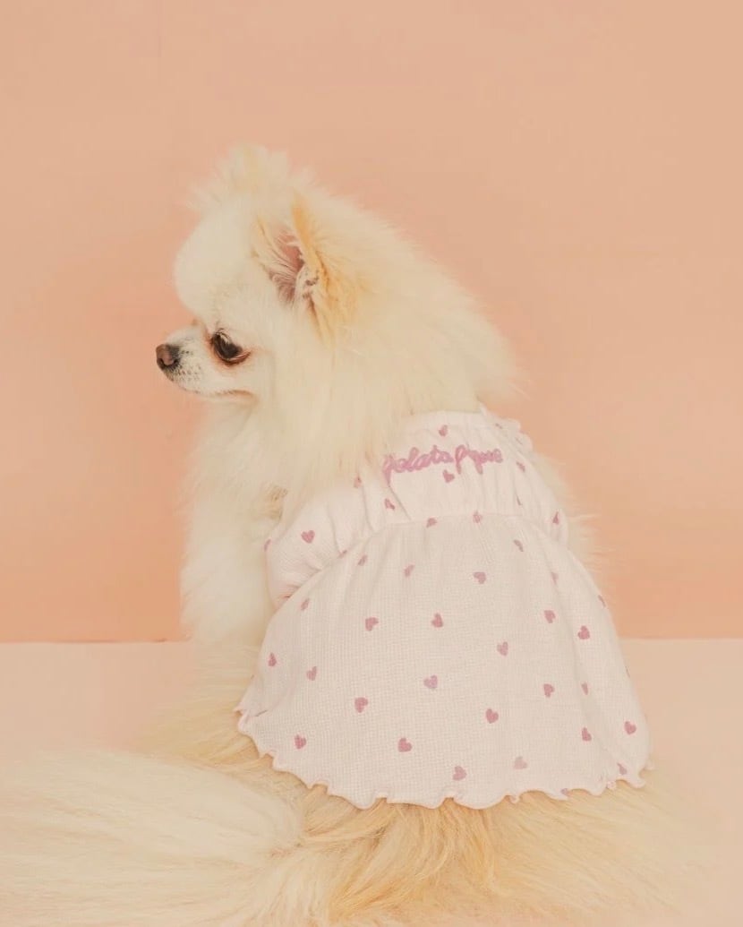 軽やかな肌触りのワッフル生地に、ちびちびハートのプリントを散りばめたガーリーなワンピースです。肩にフリル、裾にメローを入れた愛らしいシルエットで、背中にぷっくりと立体的なブランドロゴが入っています。お腹周りや肩紐にギャザーを入れているので、愛犬が動きやすく、着脱もスムーズ。色はピンクとアイボリーの2色展開です。きょうだいで色違いを揃えるのもおすすめ。同シリーズのハート型のトイとコーディネートしてお楽しみいただけます。