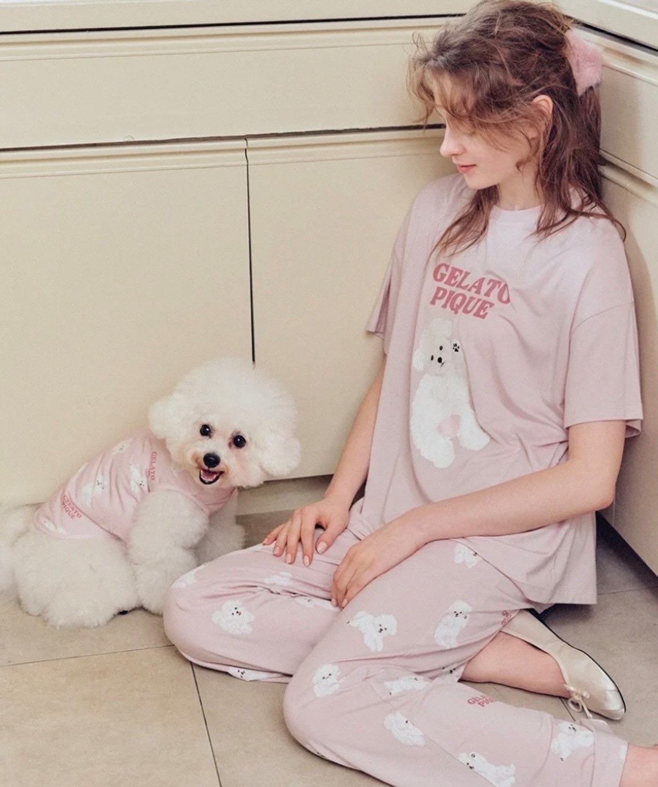 思い思いのポーズをとって、ご主人さまとお部屋でリラックス。表情豊かなトイプードル、ポメラニアン、ビションフリーゼを総柄プリントした、オーナーさんのルームウェアとリンク・コーディネートが可能なDOG柄カットソーです。さらっと着用いただける肌触りで、オールシーズンご使用いただけるように仕上げました。色はトイプードル柄のブルーとピションフリーゼ柄のピンク、ポメラニアン柄のクリームの全3色です。