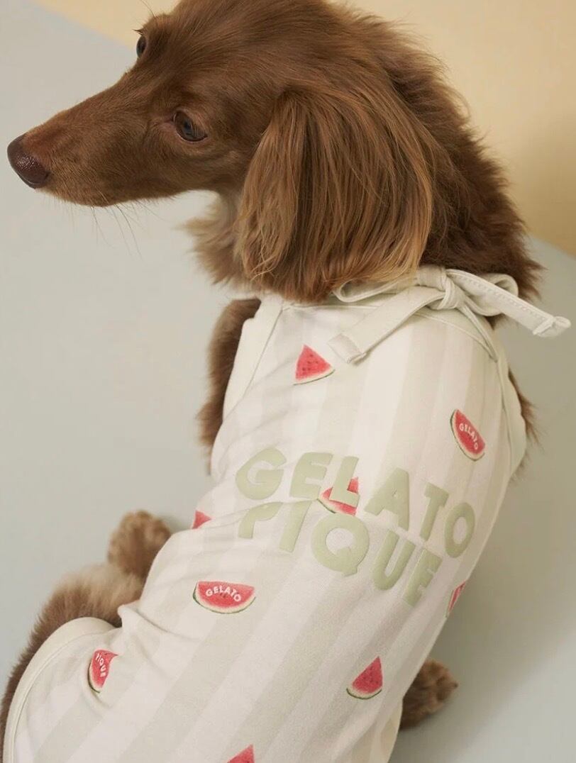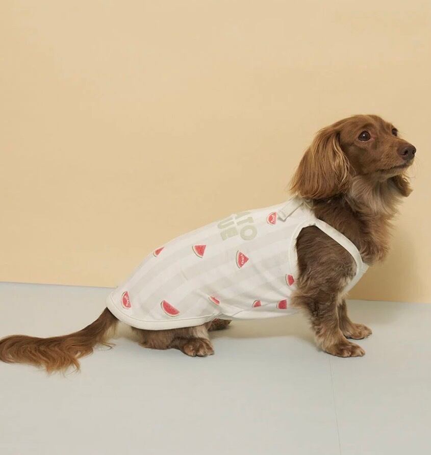 夏の気分を盛り上げるカラフルなストライプ柄に、弾けるフルーツをプリントしたCAT&DOGシリーズです。スイムウェア風のキュートなデザインで仕上げた、ひんやり心地良い接触冷感素材のダックスフンド用プルオーバー。背丈が長めのシルエットに、発泡プリントのぷっくりしたブランドロゴをあしらい、キャッチーに仕上げました。背中に保冷剤が入るポケット付きで、首元のリボンは洗濯がしやすいように解ける仕様になっています。色はラズベリー柄のピンク、スイカ柄のグリーンの2色展開。同シリーズの雑貨と組み合わせたり、きょうだいで色違いのコーディネートもおすすめです。