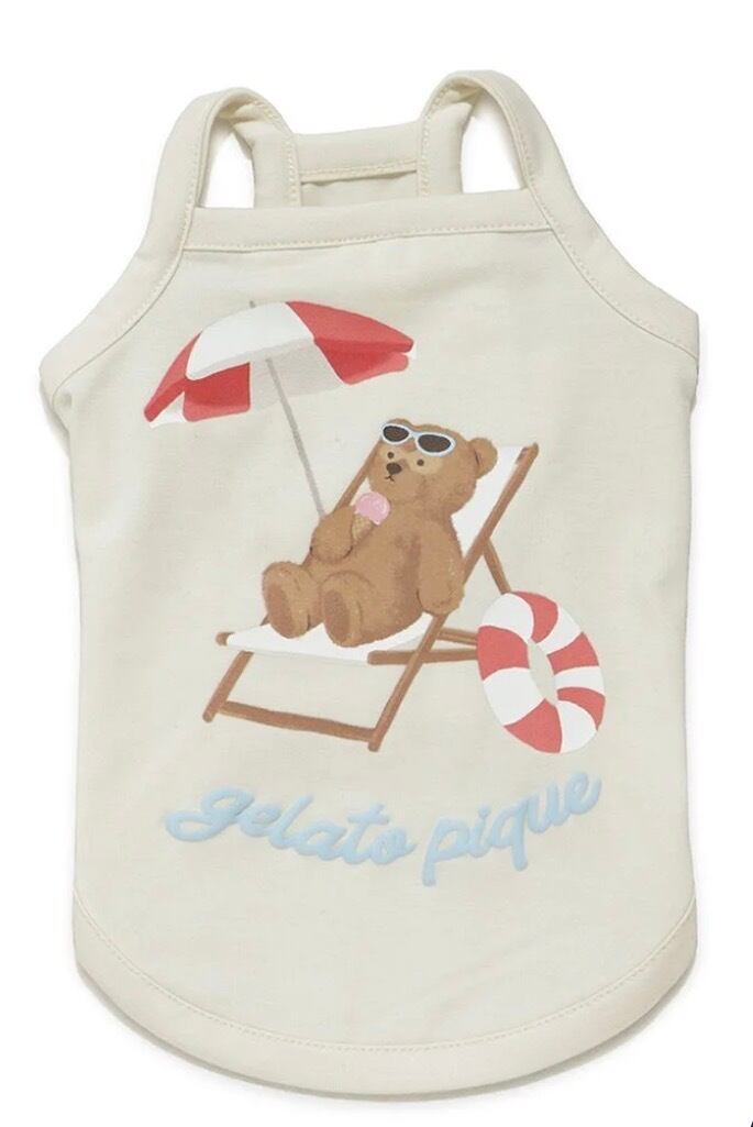 サングラス焼けしたお顔に思わず胸きゅん。夏をめいっぱい楽しむベアをテーマにした、オーナー様とお揃いでコーディネート可能なSUMMER BEARシリーズです。プールサイドでのんびりアイスを食べるベアを背中にプリントした、柔らかい接触冷感のベア天竺プルオーバー。スイムウェア風の涼しげなシルエットと背中のぷっくりとした発泡ロゴプリントがポイントです。背面に保冷剤を入れられる小さなポケットも付いているので、暑い時期のお出かけにもおすすめです。色はアイボリーとピンク、ネイビーの3色展開。同シリーズの雑貨を合わせたり、オーナー様のルームウェアとリンク・コーディネートもお楽しみいただけます。